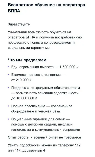 Гражданам России предлагают бесплатное обучение на оператора дрона через платформу Госуслуг, с возможностью дальнейшего приглашения на военные действия. Обещано единовременное вознаграждение в 1,5 мил