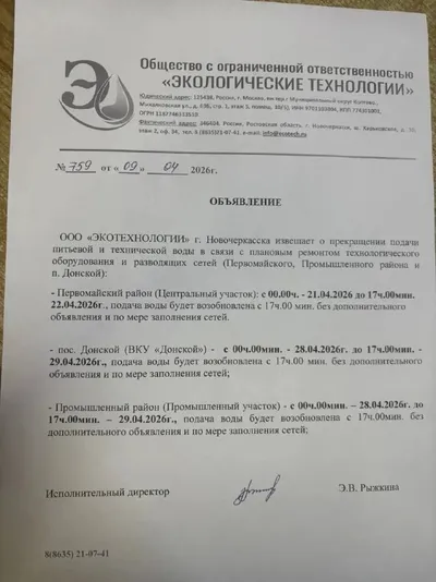Уважаемые абоненты! ООО «Экотехнологии» извещает о плановом прекращении подачи питьевой и технической воды. Предоставляем информацию по районам и датам отключения!