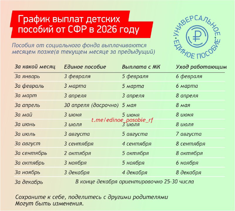 ⚡️❗️График зачисления выплат от социального фонда на весь 2026 год Выплаты от социального фонда поступают месяцем позже – в текущем месяцев за предыдущий. Выплаты каждый месяц приходят в единый д