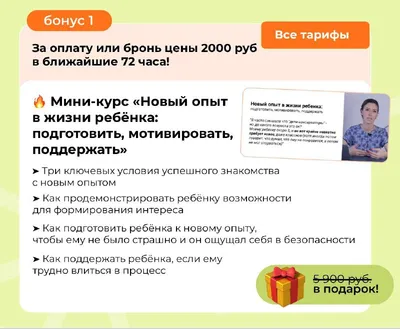 Самые выгодные условия на курс сгорят сегодня в 23:59 мск❗️ Через несколько часов исчезнут бонусы для анкеты предзаписи стоимостью более 19 000 руб: ▪️ Мини-курс «Новый опыт в жизни ребёнка: подгото