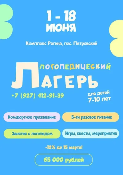 ⚡️⚡️⚡️ Летний логопедический лагерь «Я говорю красиво!» 🔥 Всего 25 мест на самый полезный развивающий отдых! ✅ Когда: 1-18 июня ✅ Где: ГК «Регина» (пос. Петровский) ✅ О смене: Лого-лагерь - это