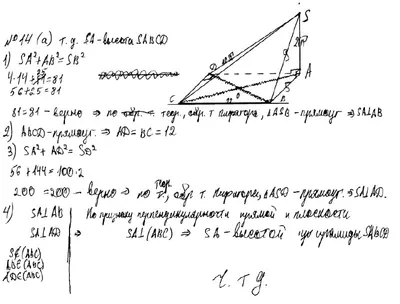 Поставим балл? Пункт🕐из стереометрии ЕГЭ 2024. Условие: В основании четырёхугольной пирамиды SABCD лежит прямоугольник ABCD со сторонами AB=5 и BC=12. Длины боковых рёбер пирамиды SA=2√14, SB=9 и