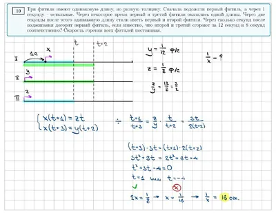 Вкуснейший №10. Попробуйте свои силы: Три фитиля имеют одинаковую длину, но разную толщину. Сначала подожгли первый фитиль, а через 1 секунду – остальные. Через некоторое время первый и третий фитили