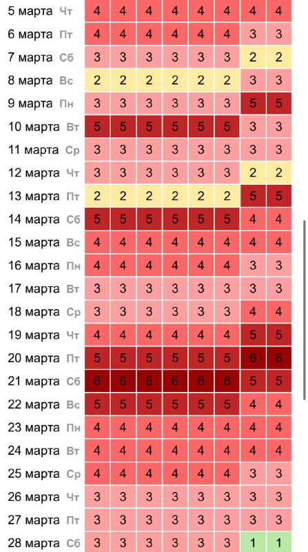 😰 Магнитные бури продлятся почти весь март. Передышки будут редкими и короткими. Первые возмущения ожидаются уже в четверг 5 марта — до 4 баллов. А самые сильные бури придутся на 20 и 21 марта, когд