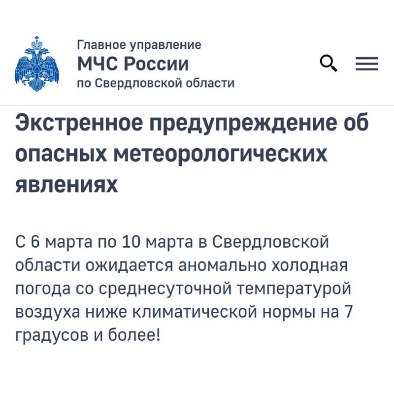 ⚡️🥶 Экстренное предупреждение выпустило МЧС Свердловской области: С 6 марта по 10 марта в Свердловской области ожидается аномально холодная погода со среднесуточной температурой воздуха ниже климати
