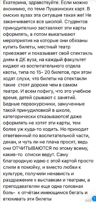 В продолжение темы про «Пушкинскую карту». Я буду публиковать письма на эту тему до тех пор, пока публично не услышу комментарии от чиновников. Вообще не понимаю, почему от школьников и студентов треб