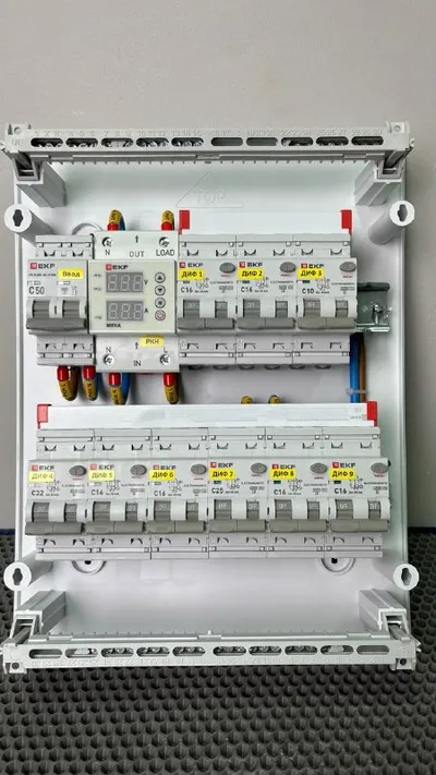 Как вам такой компактный щит для однокомнатной квартиры? На вводе – автоматический выключатель на 50 А и реле напряжения и тока MRVA. Далее – вся группа собрана на дифавтоматах PROXIMA от бренда EKF