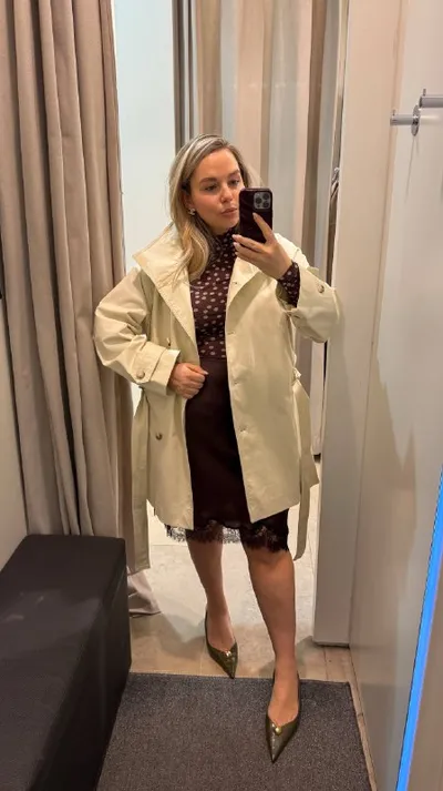 #примерка MANGO 🖤 плащ в нежном сливочном оттенке, актуальный ворот и заниженная посадка. Идеально на высоких. юбка с кружевом, эффектная, модная длина до колена, кстати, смотрится вполне хорошо!