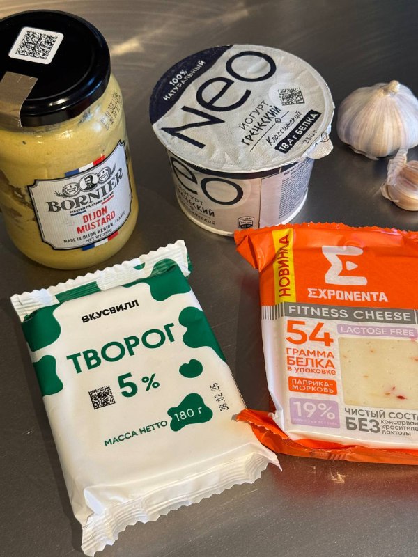 Ответ — 21 грамм ☺️ В основном за счёт намазки, а рецепт очень простой и вкусный: • 180 гр творога • 100 гр сыра (я взяла протеиновый) • 230 гр греческого йогурта • чеснок, горчица и перец по вкусу