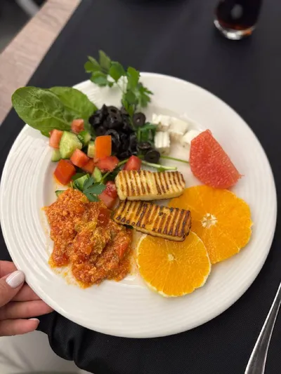 Пока не заселили, завтракаем)) Погода не очень в Сиде, солнышка нет и прохладно, +18 градусов, но ветрено))
