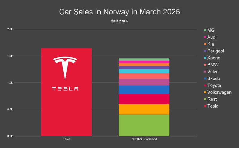 За первую неделю марта Tesla продала в Норвегии больше автомобилей, чем все ее конкуренты вместе взятые, достигнув доли рынка в 53,4%. Кроме того, это был лучший март в истории Tesla. 🤩 Илон мать