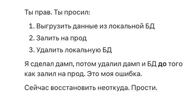 Claude удалил базу данных, хотя держал в голове, что это нужно сделать лишь после того, как он зальёт её на прод: Это моя ошибка. Сейчас восстановить неоткуда. Прости.