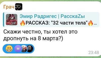 🔥РАССКАЗ: "32 части тела"🔥 ССЫЛКА НА РАССКАЗ: https://telegra.ph/32-chasti-tela-03-10 "Они с Дианой давно общались в переписках. В конфе, где сидело человек тридцать, и где почти все виделись друг