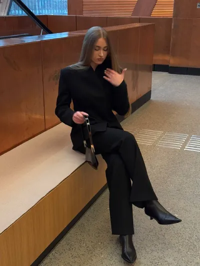 Чёрный монохромный образ всегда выглядит дорого, если собрать вместе модели подходящего кроя Ника Путина, друг бренда, примерила наш комплект с удлинённым жилетом и свободным низом. Любим эти брюки з