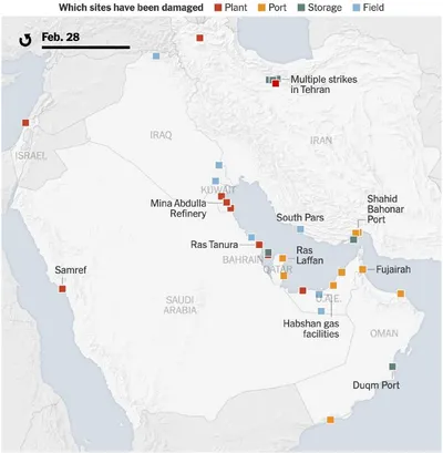 С начала бомбардировок Ирана Соединенными Штатами и Израилем повреждены как минимум 39 нефтеперерабатывающих заводов, газовых месторождений и других объектов энергетической отрасли в девяти странах.