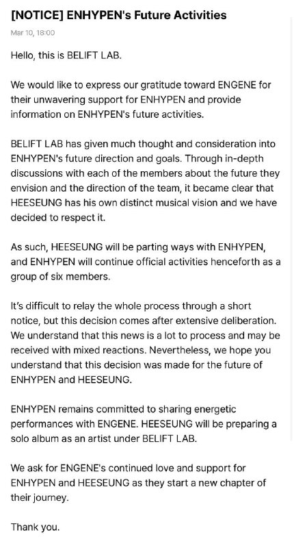 хисын заканчивает музыкальную деятельность в составе группы энхайпен и будет продолжать работать сольно… 😭😭😭😭😭😭
