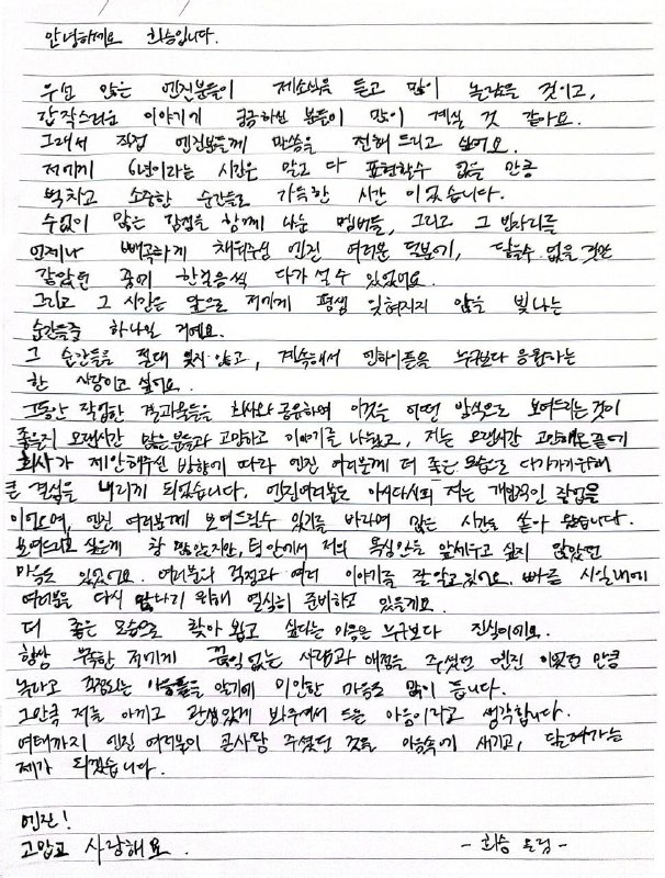 "здравствуйте, это хисын прежде всего, я предполагаю, что многие энджин очень удивлены сегодняшней новостью, и, вероятно, многие из вас заинтригованы этим неожиданным объявлением. последние 6 лет бы