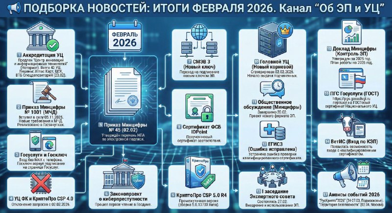 📣Подборка самых важных новостей о сфере электронной подписи от нашего канала по итогам февраля 2026 года 1️⃣Продлена аккредитация УЦ Фонд «Центр инноваций и информационных технологий» (УЦ Нотариата