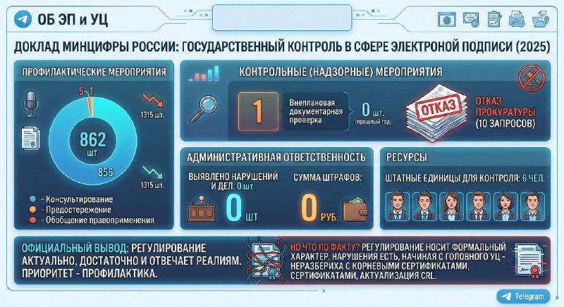 🆕Доклад Минцифры России о виде государственного контроля в сфере электронной подписи за 2025 год 🔹профилактических мероприятий - 862 шт. (в прошлом году - 1315), из них - консультирование - 856, об