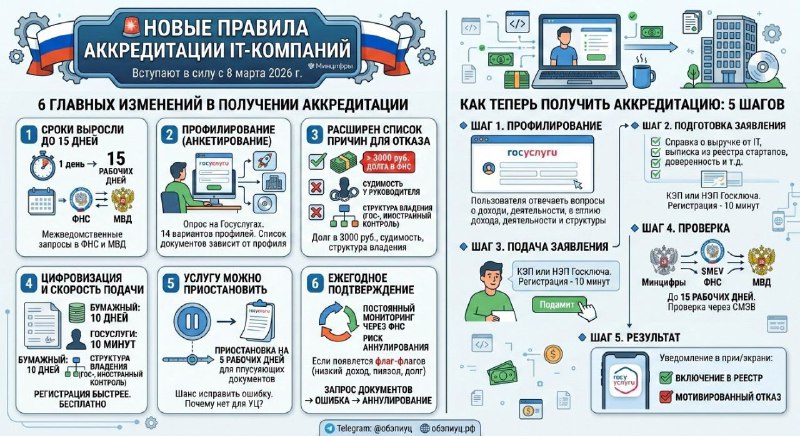 🚨Новые правила аккредитации IT-компаний Сегодня 8 марта 2026 года, вступает в силу новый административный регламент аккредитации ИТ-компаний, утвержденный приказом Минцифры от 15.12.2025 № 1172. Пр