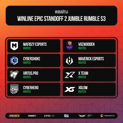 Список команд, которые получили инвайты на WINLINE EPIC Standoff 2 Jumble Rumble S3 😈 🫶 Mafiozy eSports 😇 CYBERSHOKE 🐻 Virtus.prо 🐊 CYBERHERO 😀 VozWooden 😀 Maverick Esports 💪 X Team 💪 XGlow