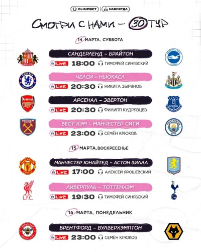 🏴 Расписание 🔥 Переключаемся с еврокубков к просмотру любимой АПЛ: 🗓 Суббота, 14 марта 18:00: 🏴«Сандерленд» — «Брайтон»🏴 20:30: 🏴«Челси» — «Нью