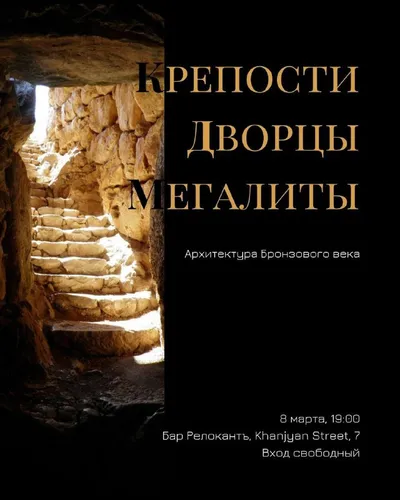 📍 Воскресенье 08.03. Бар Релокантъ 📜 Продолжение серии лекций о Бронзовом веке в Армении. Лекция Павла Сапожникова: «Крепости, дворцы, мегалиты. Архитектура бронзового века» Бронзовый век — эпоха,