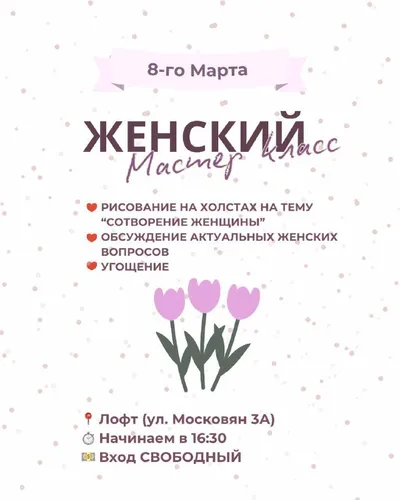 Всем привет, 8 Марта в Лофте будет красивейший сладкий стол, мастер класс по рисованию с акрилом. Тема: сотворение женщины. Потом чай,кофе и интересные животрепещущие женские темы. ВХОД СВОБОДНЫЙ, ме