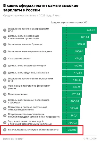Экологический консалтинг вошёл в топ самых оплачиваемых сфер в России. Средняя зарплата в отрасли превысила 333 тыс руб — в три с лишним раза выше медианы по стране, следует из данных Росстата. Вер