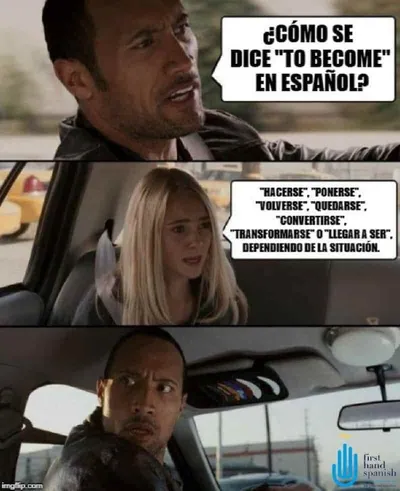 Мем на сегодня с пометкой: “типа легкий испанский.. говорили они” 😁 Перевод: – Как сказать “становиться” на испанском? – [Проговаривает 7 синонимичных слов для “становиться” в испанском]. Зависит от