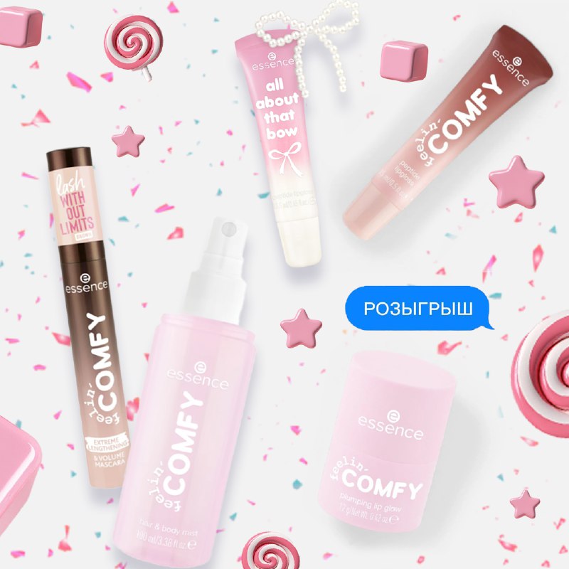 ЗАПУСКАЕМ РОЗЫГРЫШ✨ Дарим набор косметики essence! Да-да, там четыре продукта из лимитки feelin' comfy, а ещё блеск для губ, которого ещё даже нет в продаже! Условия розыгрыша: 👉🏻 подпишись на наш