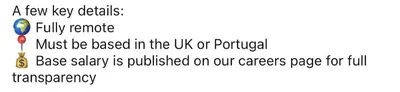 Когда-нибудь компании перестанут писать «fully remote», а следом «работать можно только из 2х локаций». Но не сегодня, не сегодня…. Логичнее написать «remote within UK or Portugal». Но нет..)