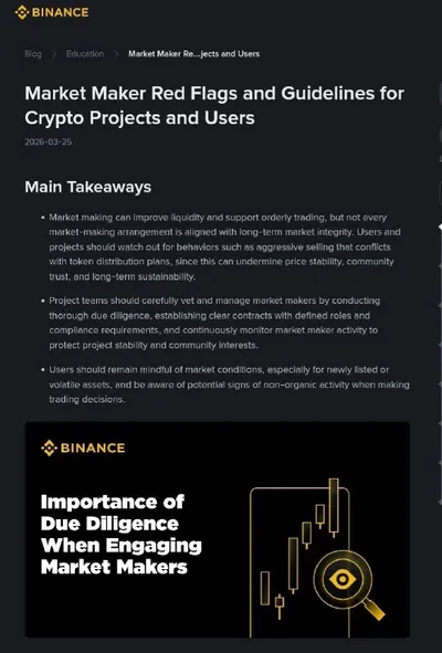 Binance опубликовала обновленное руководство для маркетмейкеров, обязывающее эмитентов токенов раскрывать платформе информацию о маркетмейкерах Теперь запрещены соглашения о разделе прибыли и гаранти