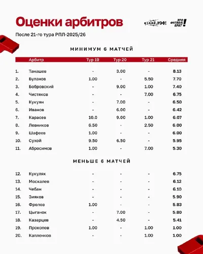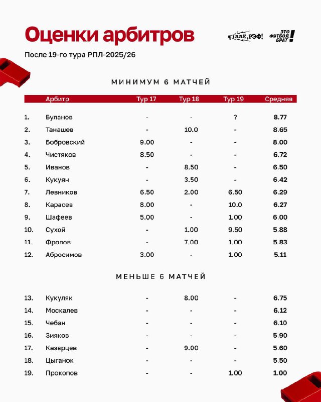 Рейтинг арбитров после 19 туров Евгений Буланов получит оценку за матч Сочи на следующей неделе и, возможно, спустится с первой строчки. Пока любуемся десяткой Карасева и рекордными четырьмя 1️⃣.