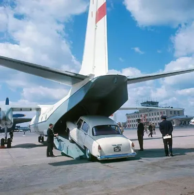 Погрузка автомобиля «Волга» в самолёт Ан-24РТ в Шереметьево, 1969 год.