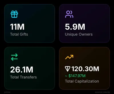 Подарки преодолели новый рубеж 🎁 На данный момент в обороте уже 11 млн NFT 🍿 А так же, 5,9 миллиона холдеров, более 26 млн передач подарков за все время и 120 млн $TON капитализации. Что это нам