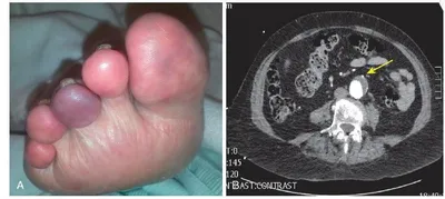 Синдром синего пальца у пациентов с аневризмой брюшной аорты ______________ Синдром синего пальца (blue toe syndrome) при аневризме брюшной аорты — это острая ишемия пальцев стоп, вызванная эмболией