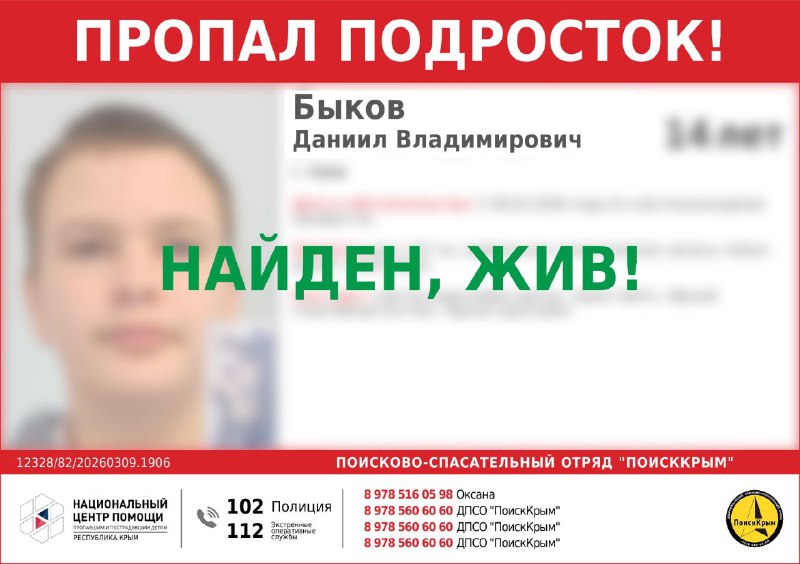 Обратите внимание! Пропал Быков Даниил Владимирович, 14 лет (2011 г.р.) г. Саки, Республика Крым С 9 марта 2026 года его местонахождение неизвестно. Просим сообщать любую информацию, связанную с пои