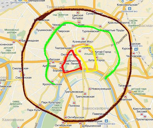Современная карта: 1. Московский Кремль (красная линия) 2. Китай-город (желтая линия) 3. Бульварное кольцо (зеленая линия) 4. Садовое кольцо (коричневая линия) #москва #четырекольцамосквы