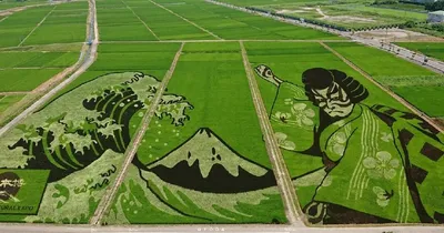 Японские фермеры используют сорта риса, которые приносят урожай естественных оттенков зеленого, фиолетового, желтого и красного цветов, чтобы создавать эти гигантские произведения искусства. Интересн