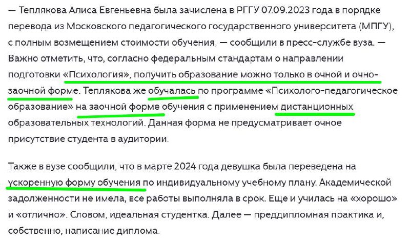 🙈 Пресс-служба РГГУ подтвердила, что Алиса Теплякова получила диплом. Перевожу сообщение с пиарщического на русский: специальность Алисы не соответствует образовательным стандартам, диплом за нее пис
