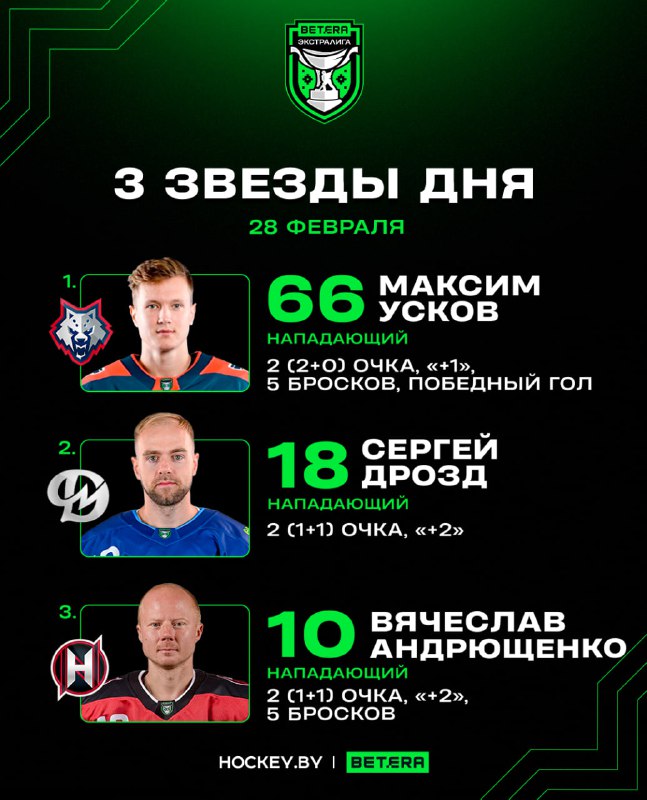 ⭐️ Максим Усков, Сергей Дрозд, Вячеслав Андрющенко – три звезды субботы в Betera-Экстралиге 🐺 Нападающий «Металлурга» оформил дубль в ворота «Гомеля», первая из его шайб оказалась для «волков» побед