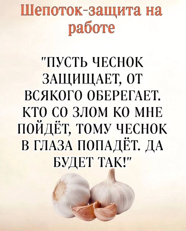 ШЕПОТОК - ЗАЩИТА НА РАБОТЕ Спрячьте дольку чеснока на рабочем месте где угодно и скажите на него три раза эти слова: "ПУСТЬ ЧЕСНОК ЗАЩИЩАЕТ, ОТ ВСЯКОГО ОБЕРЕГАЕТ. КТО СО ЗЛОМ КО МНЕ ПОЙДЁТ, ТОМУ ЧЕС