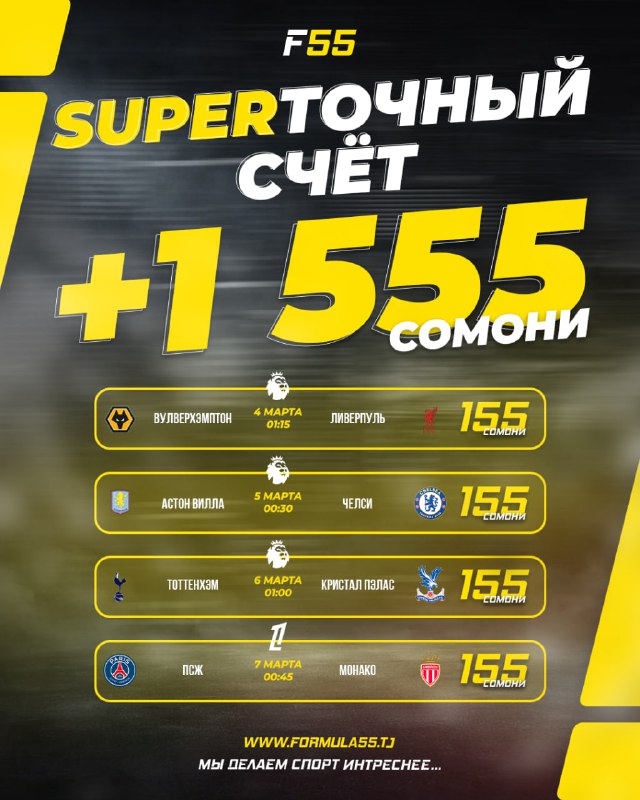 👆КОМПАНИЯ «FORMULA55» СТАЛА ТИТУЛЬНЫМ СПОНСОРОМ ПЕРВОЙ ЛИГИ ТАДЖИКИСТАНА-2026👆 🇹🇯 Футбольная лига Таджикистана и национальная букмекерская компания «Formula55» заключили соглашение, согласно кото