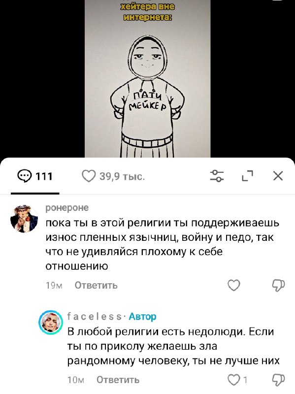 Дожили. Я оказывается несу ответственность за действия дегенератов😳 А у меня вопрос: в какой религии не было хоть одного имбецила? А среди атеистов нет преступников? А может я еще за людей из своей н