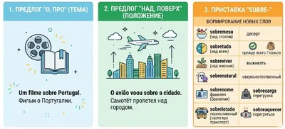 Многие знают слово sobre как предлог "о" (о чём-то): ▫️Um filme sobre Portugal. Фильм о Португалии. Но sobre - это ещё и "над, поверх, сверх": ▫️O avião voou sobre a cidade. Самолёт пролетел над го