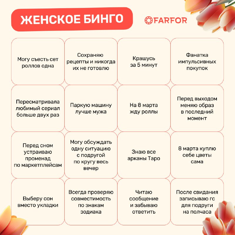 🤭 Нет, ну только я так могу! Собрали самое женское бинго с моментами, знакомыми каждой. Узнали себя? Отмечайте совпадения и делитесь в комментариях, сколько клеточек закрыли. Если больше половины