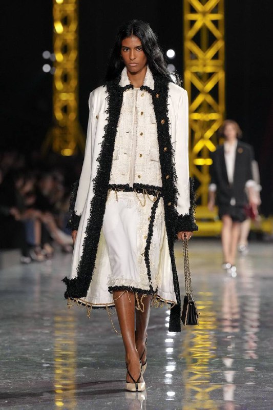 Расслабленный Chanel осень-зима 26/27 🐚Твид более объемный и мягкий: букле, бахрома, пушистые нити, декоративные края. 🐚Силуэты 20х и 60х. Прямые платья, заниженная линия, плиссе 20х и короткие жа