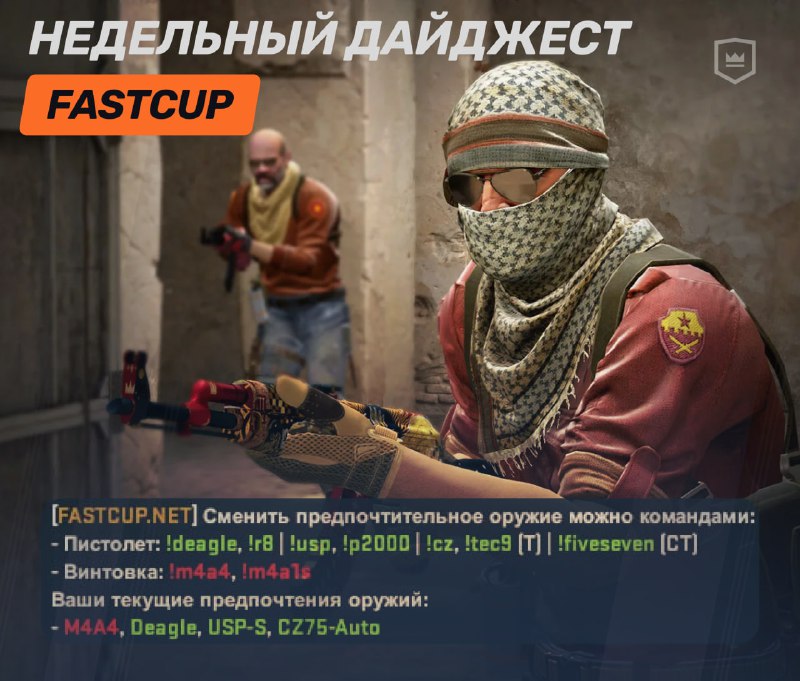 ✍️ Собрали для вас ключевые новости 🏆 FASTCUP за последние дни! 🔫 Обновили стартовое оружие! ➡️ Теперь USP-S установлен стартовым пистолетом При желании Пистолет и Винтовку можно сменить прямо во