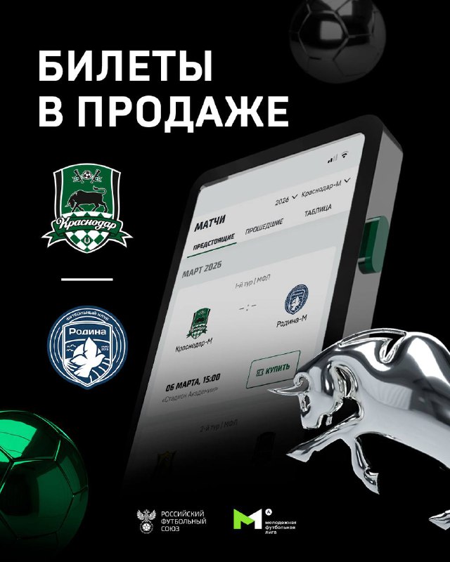 ⚡️ Билеты на матч открытия МФЛ в продаже! В первой официальной игре 2026 года «Краснодар» на родном стадионе Академии примет «Родину» 🤝 Забирай тикеты на ticket.fckrasnodar.ru 🎫